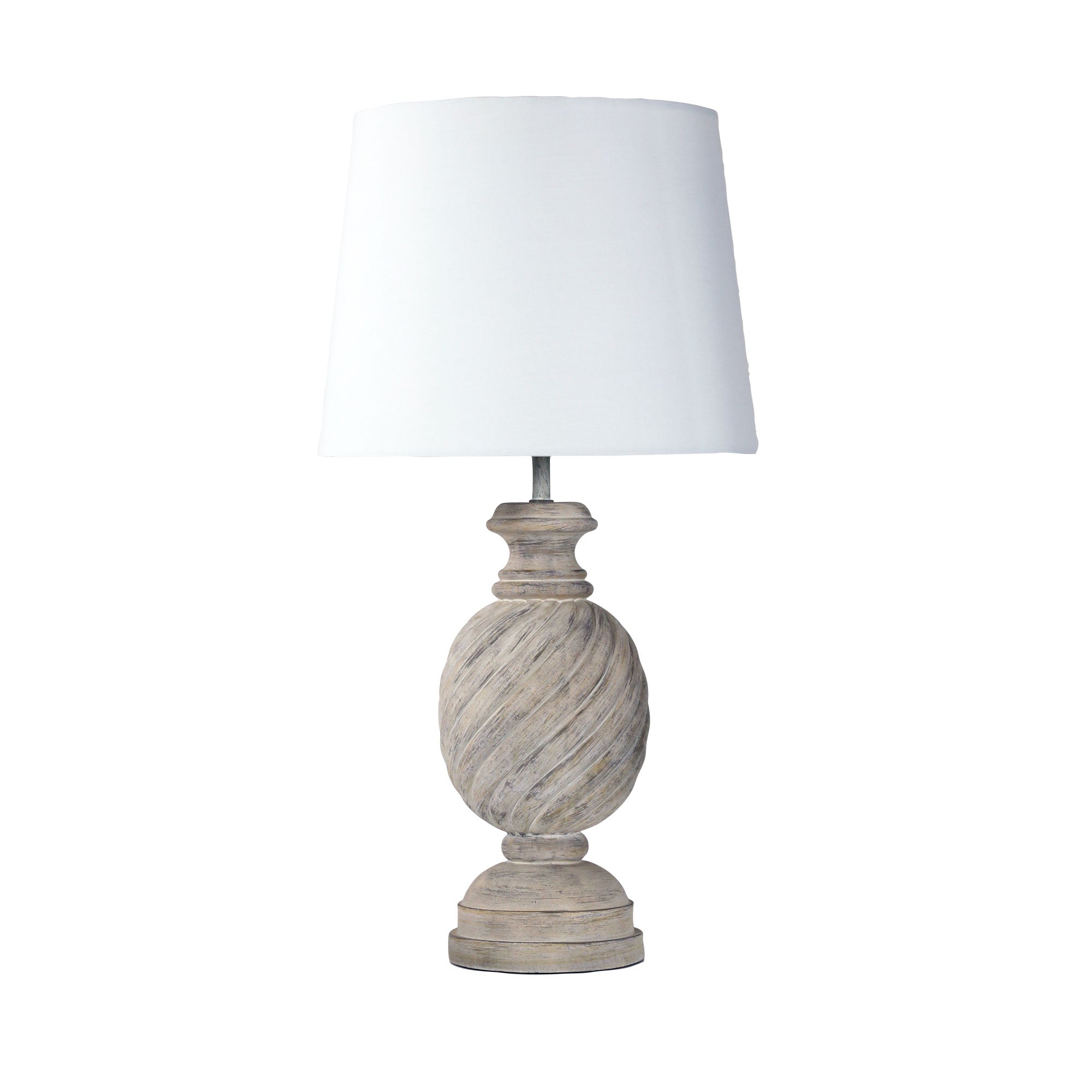 The Carlisle white resin table lamp comes complete with an off-white shade. At 52cm tall, the Carlisle is a statement piece that can adapt to most rooms in your home. The on/off switch is located on the cord.