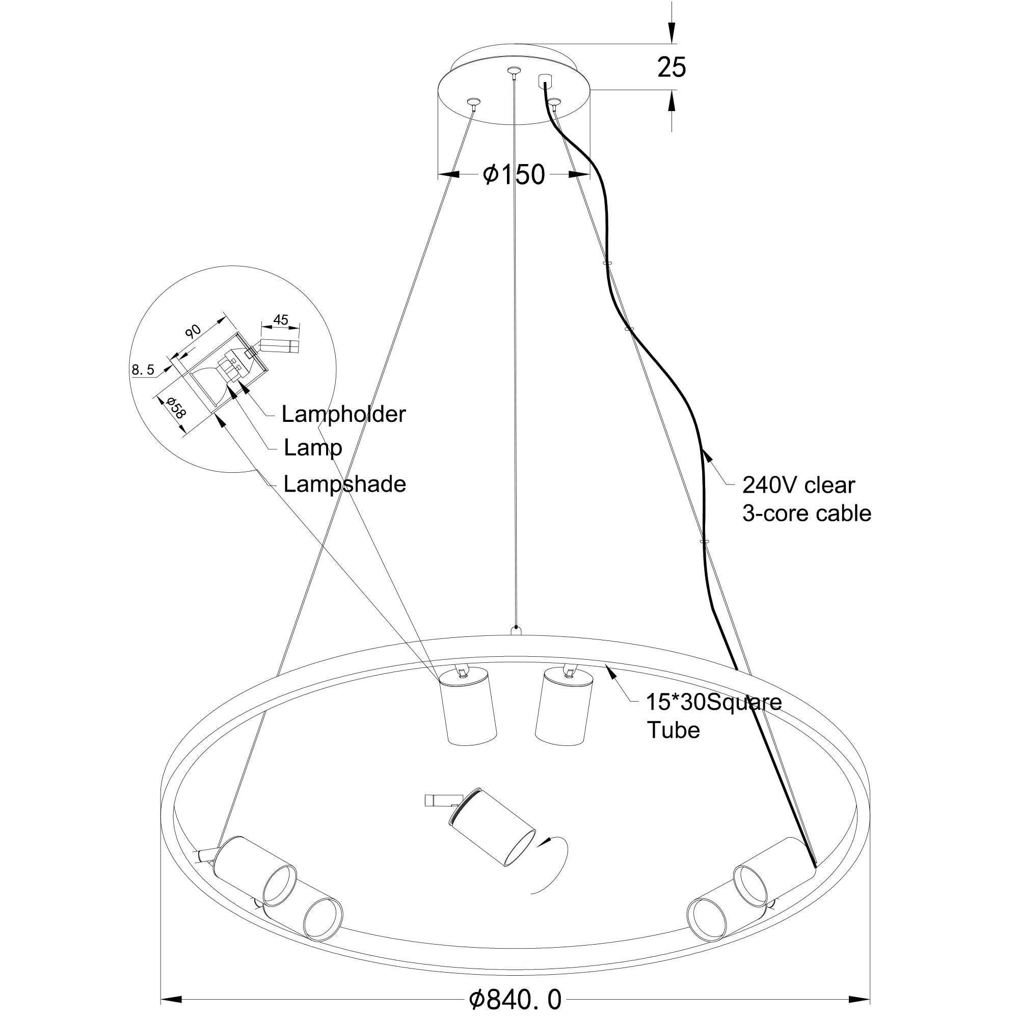 The PANO 6 light pendant uses replacable GU10 globes making maintenance easy. The spot-heads on the PANO are fully adjustable, allowing direction both up and down. The front of the spot-head is removeable for easier globe replacment. The stainless wire suspension is adjustable in length at installation, from approximately 50cmm down to the full suspension length of 150cm. PANO is supplied without globes, allowing the end user to select the most appropriate light source for their application. Ideal choice for a dining table or servery.