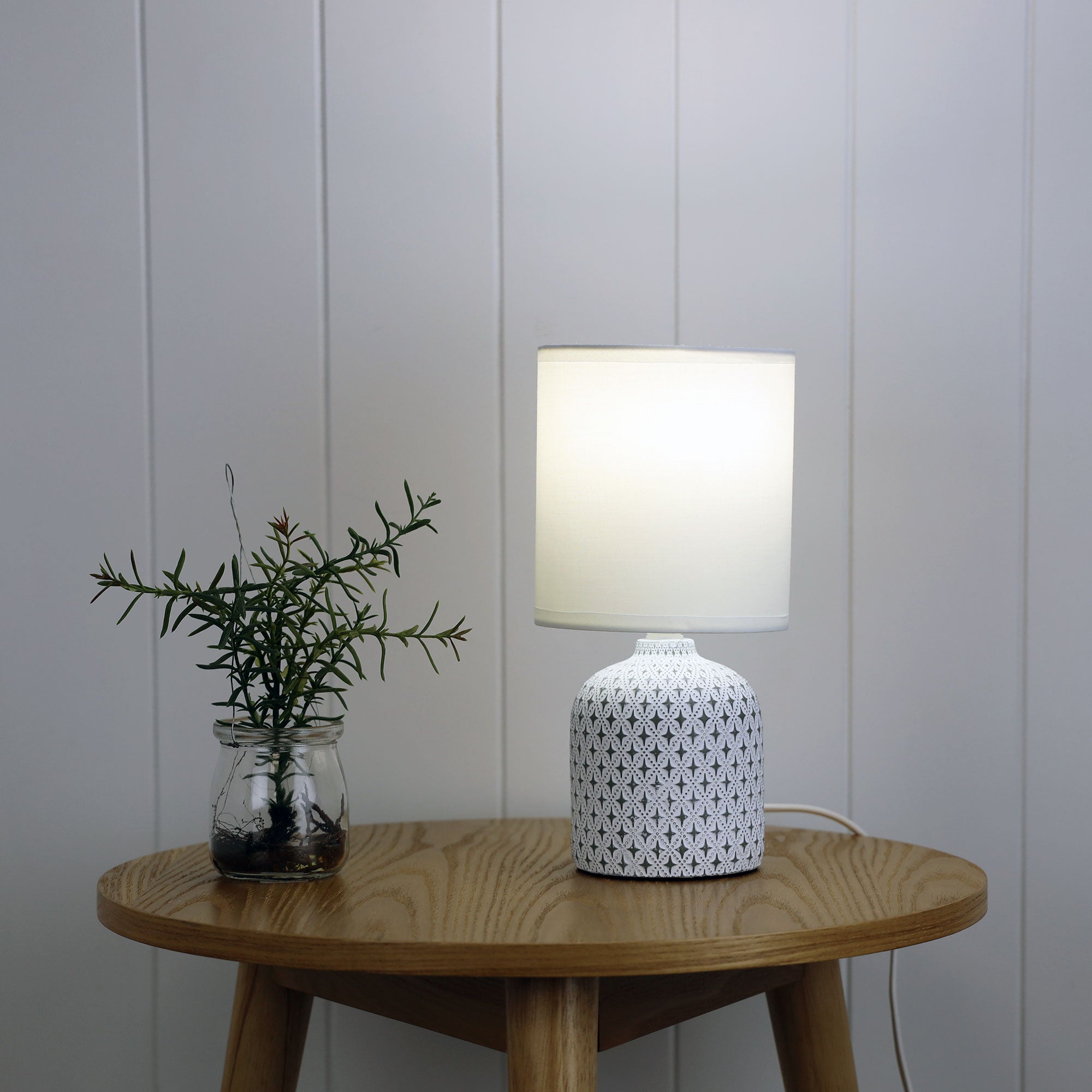 The Vera white ceramic table lamp comes complete with a white drum shade. At 26cm tall, the Vera is a compact and practical lamp that perfectly suits a study nook or bedside table. The on/off switch is located on the cord.