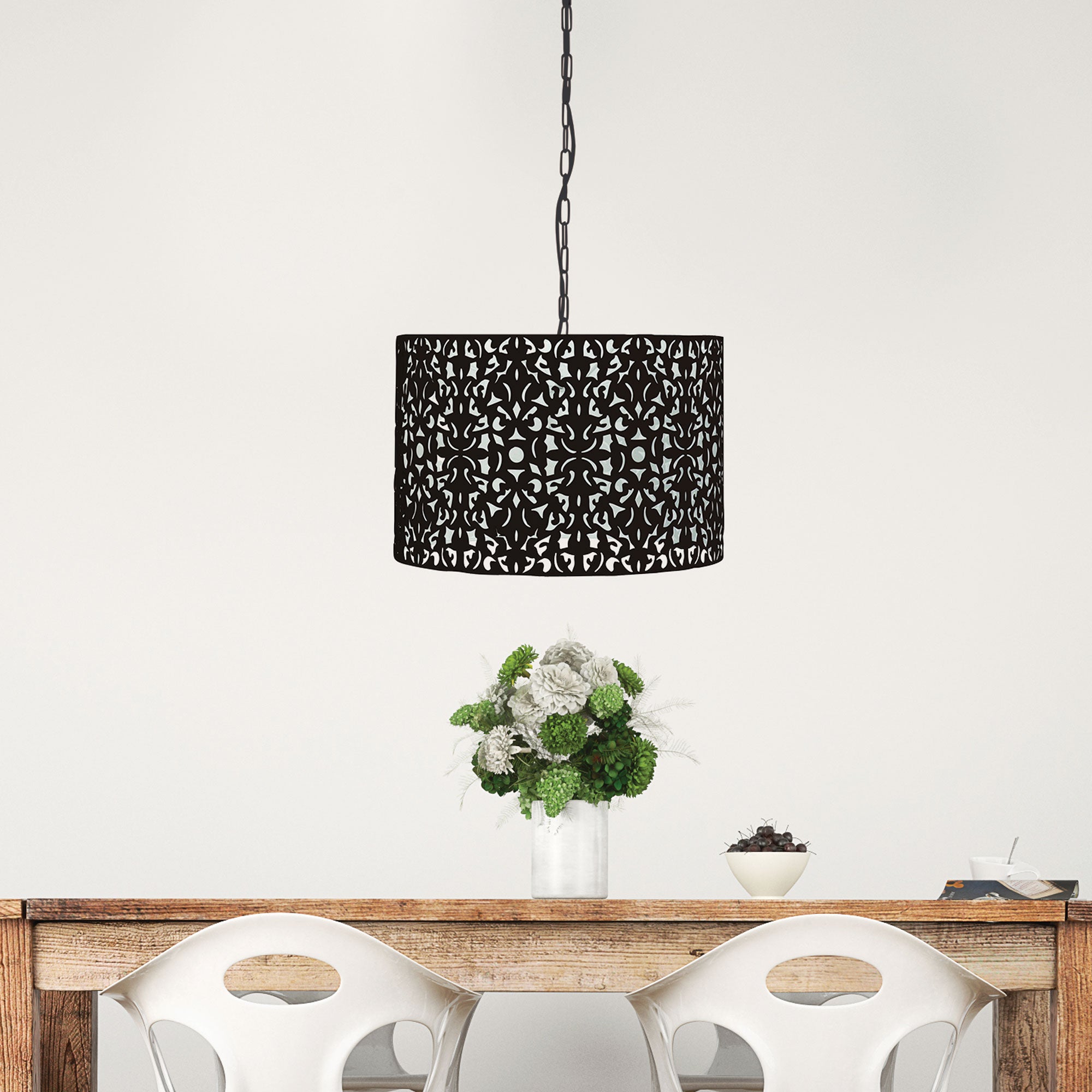 Our popular Vicky range is stunning when lit, as the cut-out design in the metal shade is reflected onto the ceiling or wall. This Vicky pendant features a matt black painted metal shade, suspended on a chain with a matching canopy.