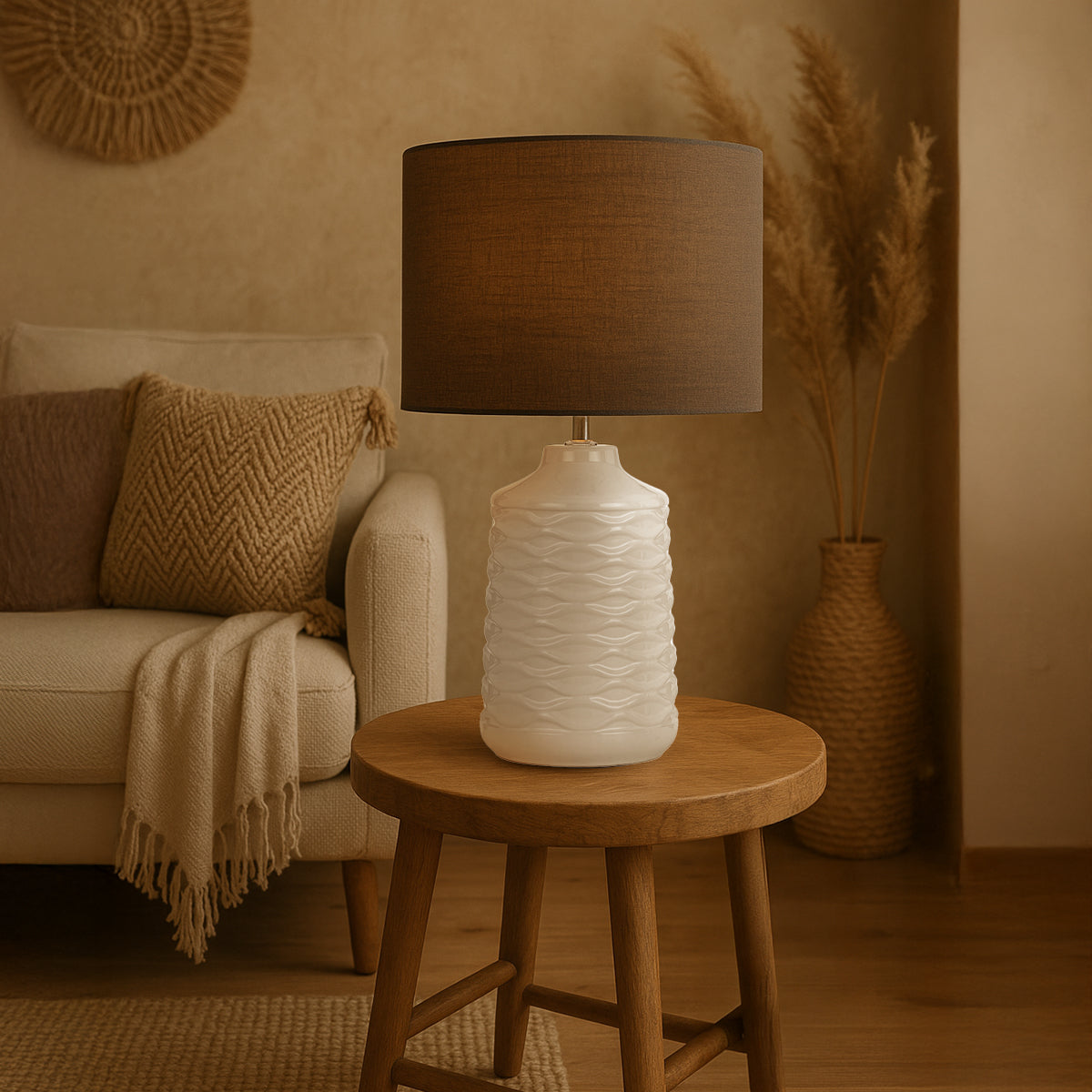 Beautifully crafted from ceramic with a ripple wave texture, the Agra glazed table lamp is finished in either a blue, butterscotch or white glaze.