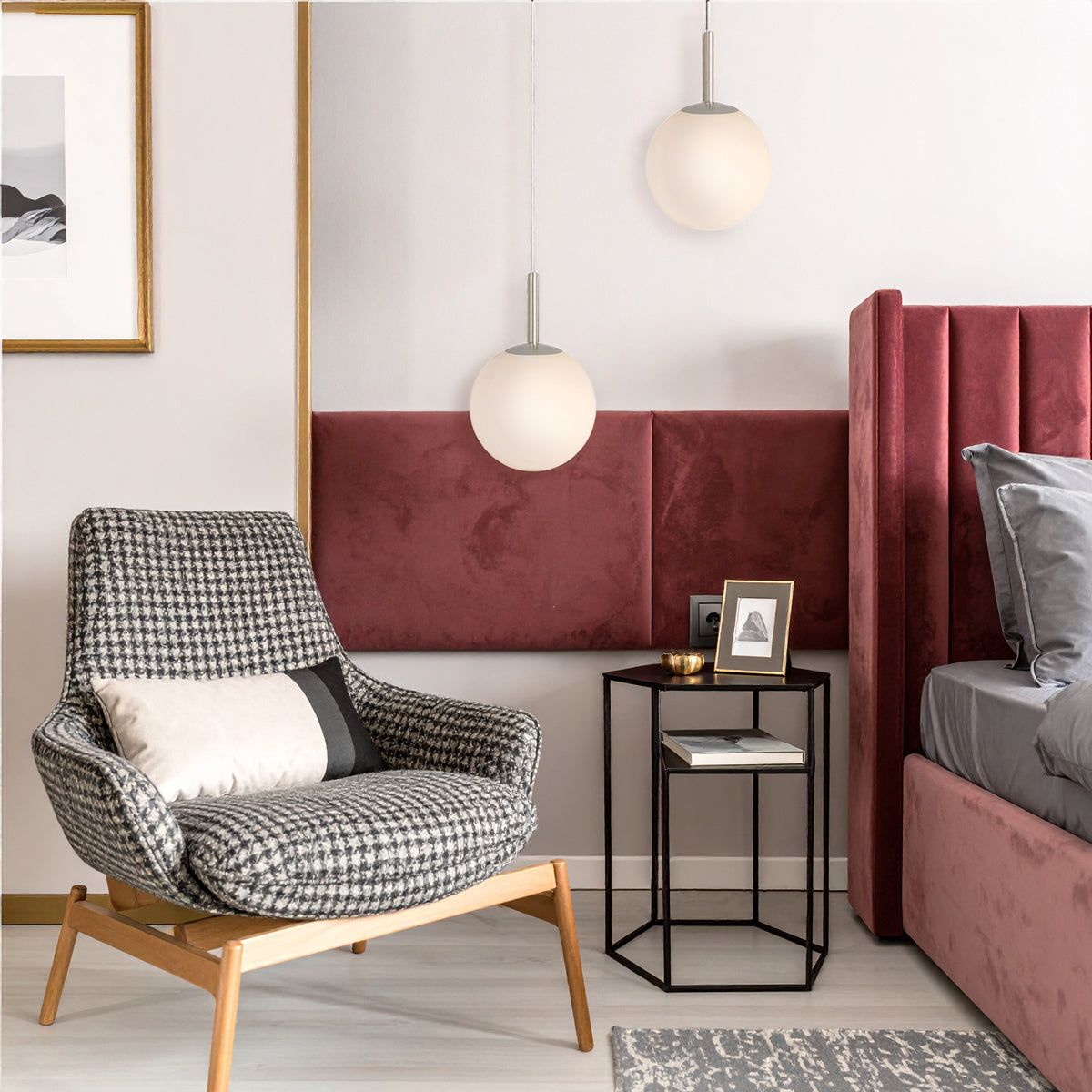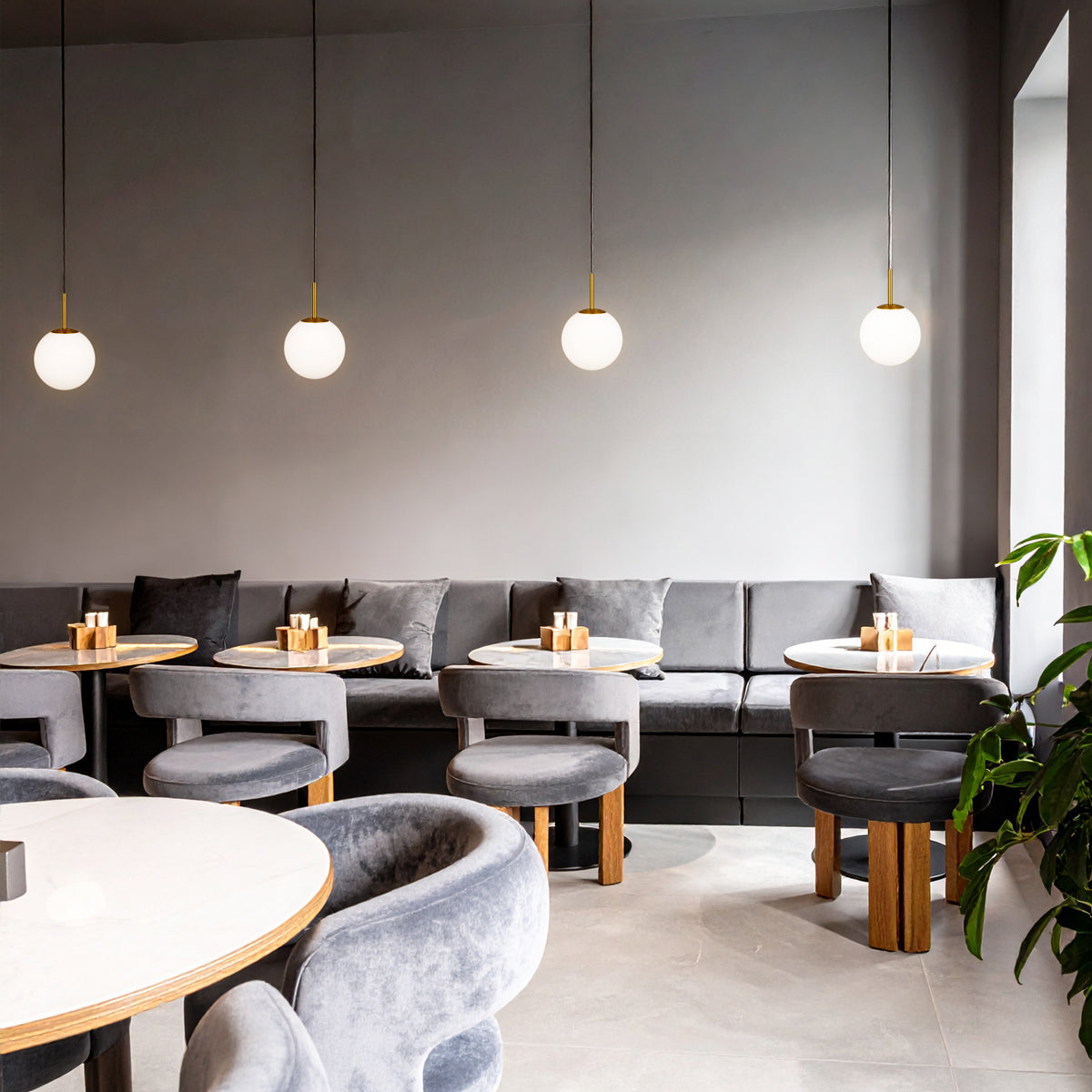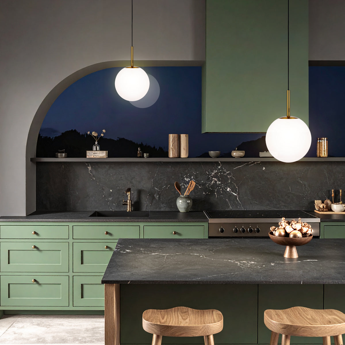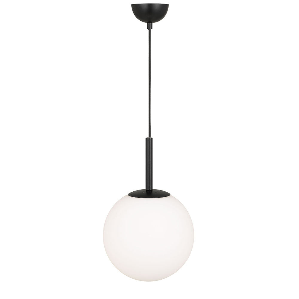 The Bally pendant is the essence of pure and simple lighting design. The sphere is finely blasted opal glass resembling the surface of fresh snow. The rounded shape is continued with the minimal metal gallery. A short metal stem finishes the story of mid-century modernism. Available in 4 sizes and 3 metal finishes.