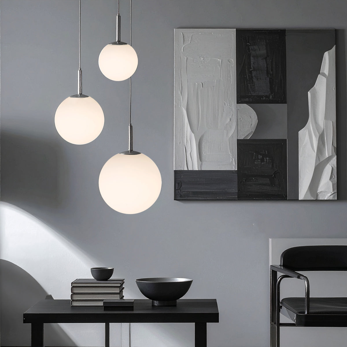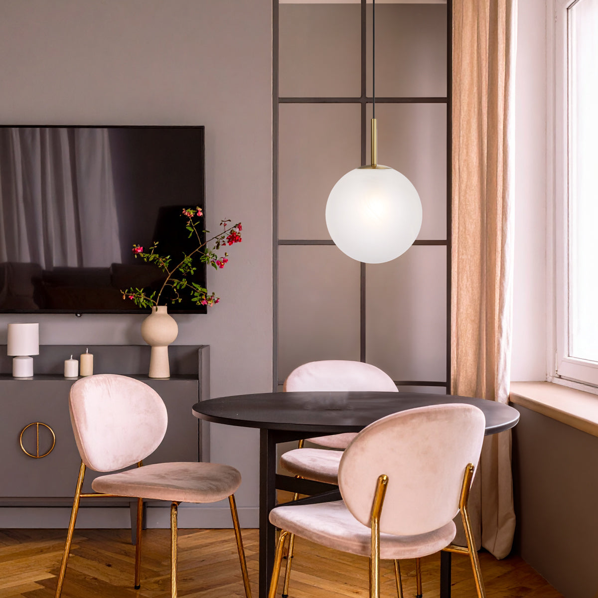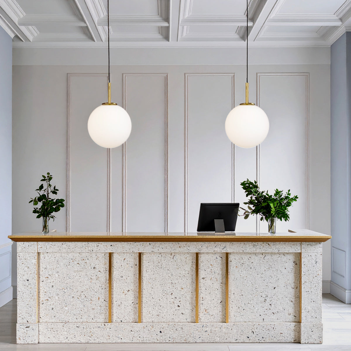 The Bally pendant is the essence of pure and simple lighting design. The sphere is finely blasted opal glass resembling the surface of fresh snow. The rounded shape is continued with the minimal metal gallery. A short metal stem finishes the story of mid-century modernism. Available in 4 sizes and 3 metal finishes.