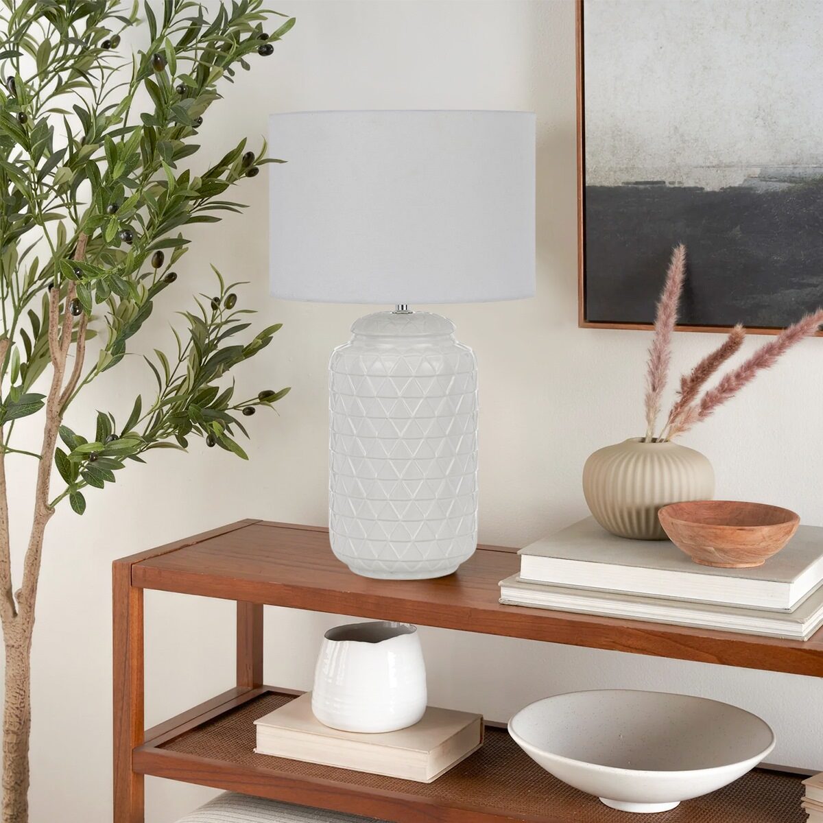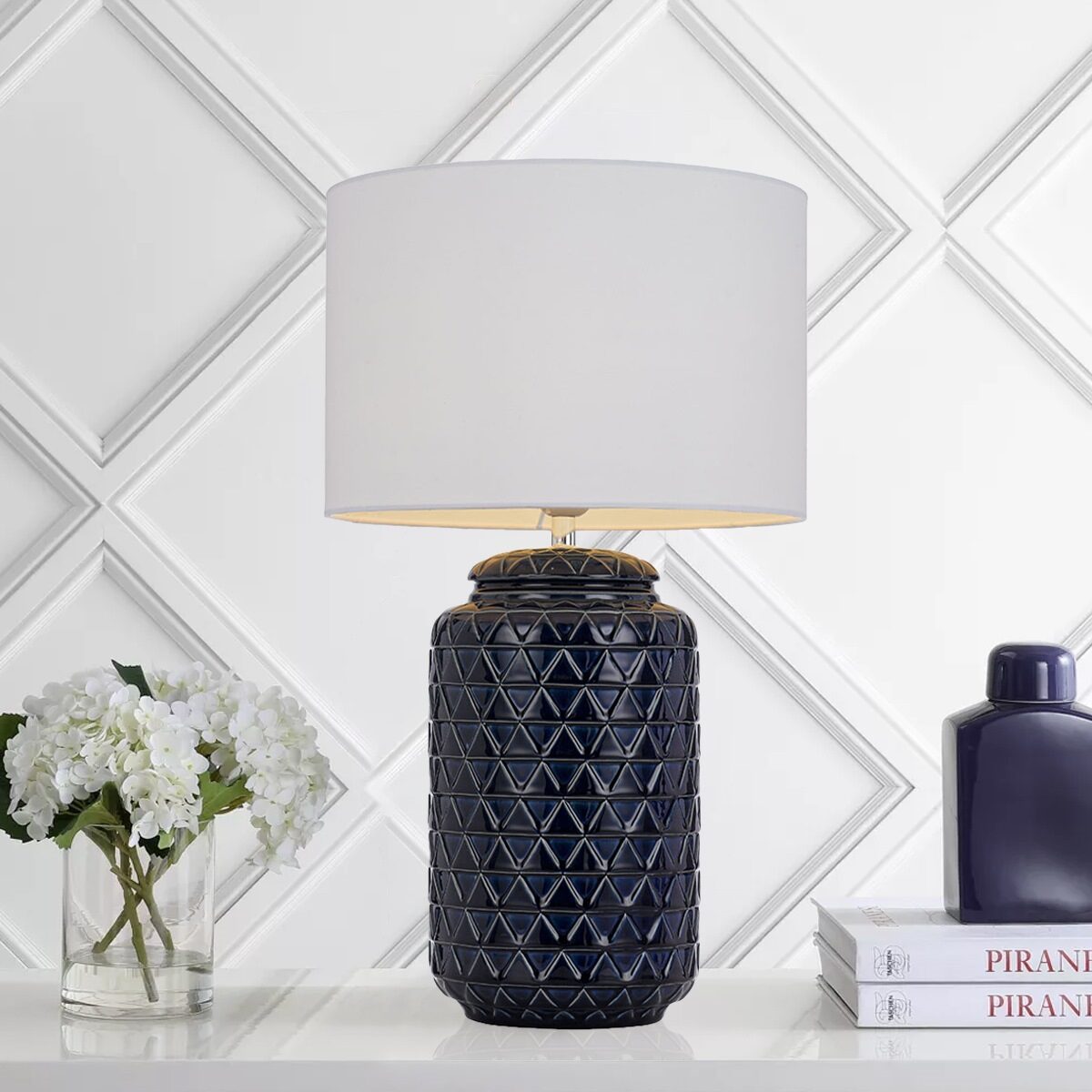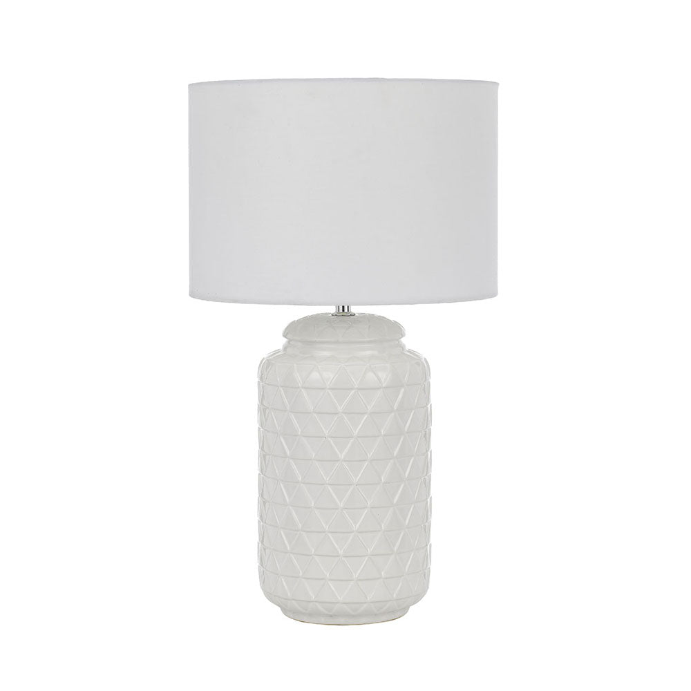 The perfect table lamp for accenting bedrooms, living areas, and entryways. The modern angular symmetrical pattern in the latest designer colours. Topped in a classic, white poly-cotton drum shade.