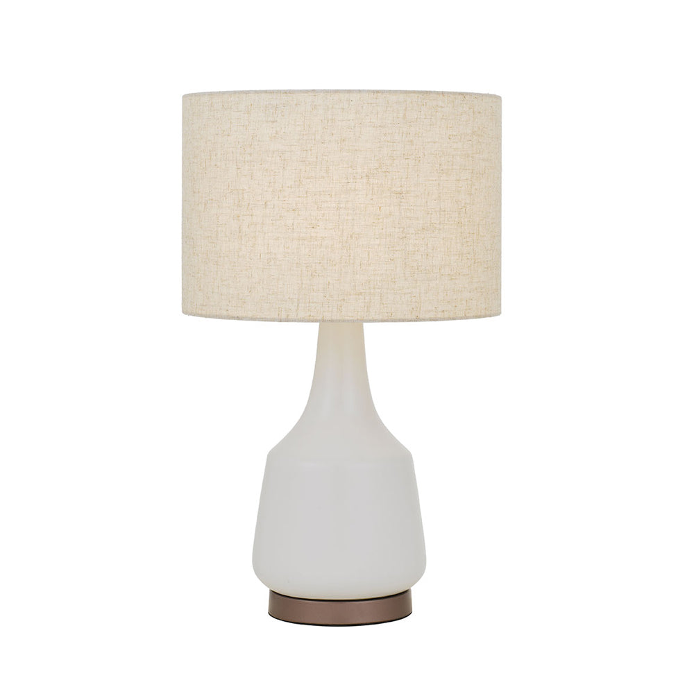 The JACIN table lamp is a gourd like shaped silhouette from natural satin ceramic. The timber pedestal adds that scandi touch and the warmth continues with the natural oat fabric drum shade. Ideal for transitional and coastal themes. Available in olive or white.