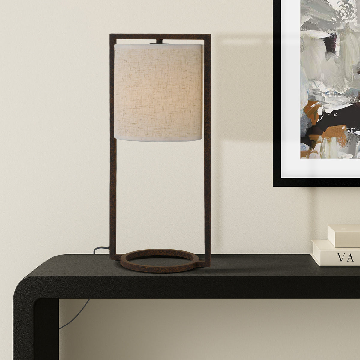 The Loftus table Lamp has an industrial modern farmhouse feel. Made of a boxed iron frame, together with a linen drum shade giving it a nostalgic Americana identity.