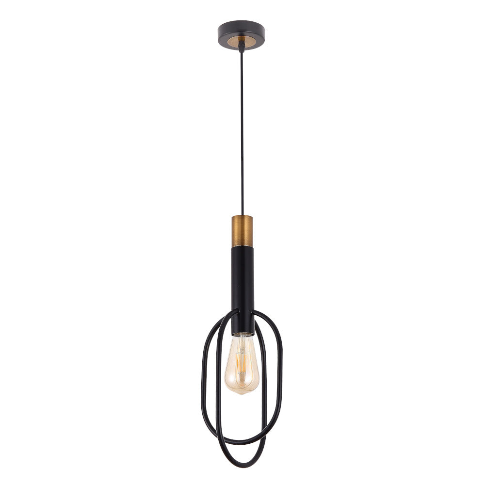 The Marvin 1 pendant is oval opposing shapes framing the recommended old school pilot LED globes. The shapes are fixed to a long cylinder and suspended by cable. The ceiling canopy is round with contrasting bright metal discs.
