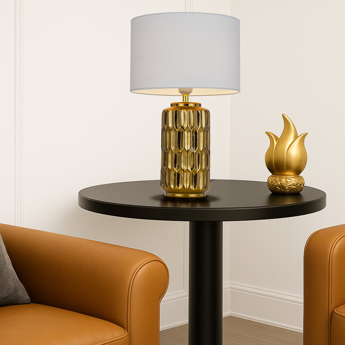 The Nisha table lamp is a cylindrical fabric shade and an artfully designed lamp base made of ceramic in high polished gold. The light is diffused through a fabric shade. As evening accent lighting in the living room and bedroom, the Nisha becomes a pleasantly illuminated focal point.