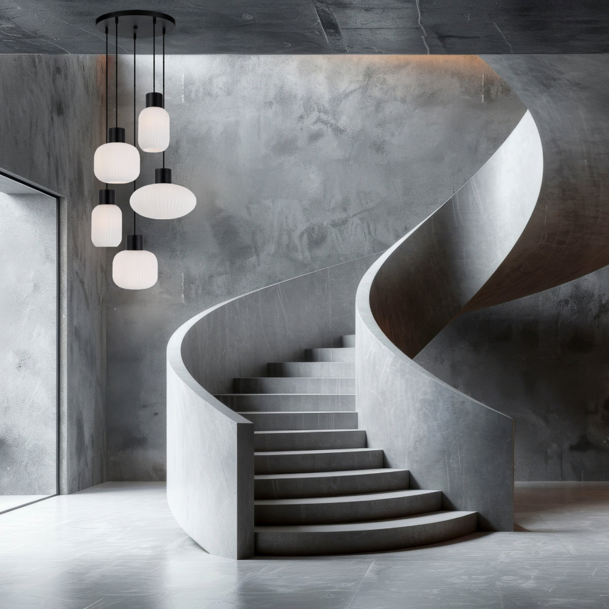 The Nori family is inspired by the traditional lanterns and now on offer with a modernist interpretation. Three unique mouth-blown glass shapes are patterned with a soft ribbed surface that provides a subtle atmospheric light. The glass is offered in opal matt, the metalware is a rich satin black, while the pendants are suspended with textile cable. Available as single and multi-light pendants and as a floor and table lamp.