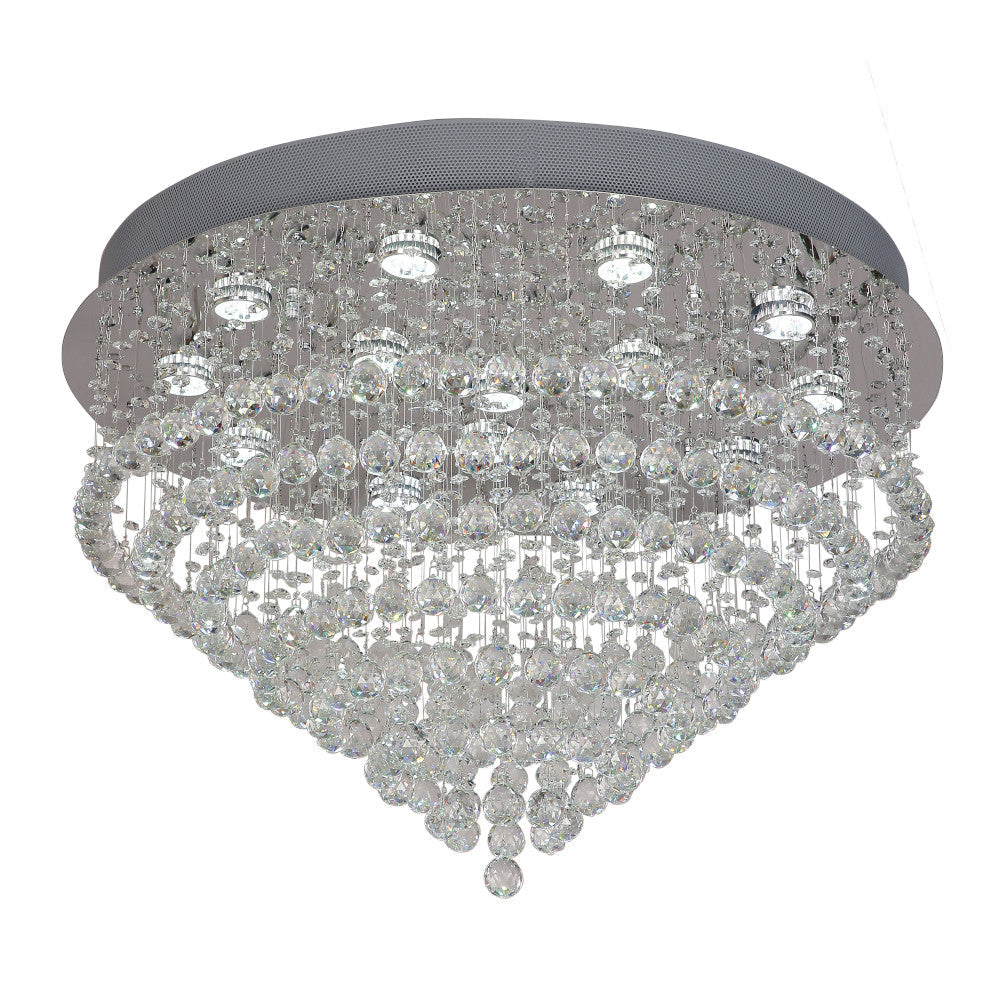 The SAVINA Round crystal collection makes a spectacular statement with lavish crystals and glowing LED light. Dramatic baskets and leaf waterfalls of hand-polished crystal spheres with sparkling beads suspend from the ceiling, shimmering light through each strand. The fixture is pre-trimmed with the crystal strands of fixed lengths, mounted to a precision-cut stainless steel ceiling plate.